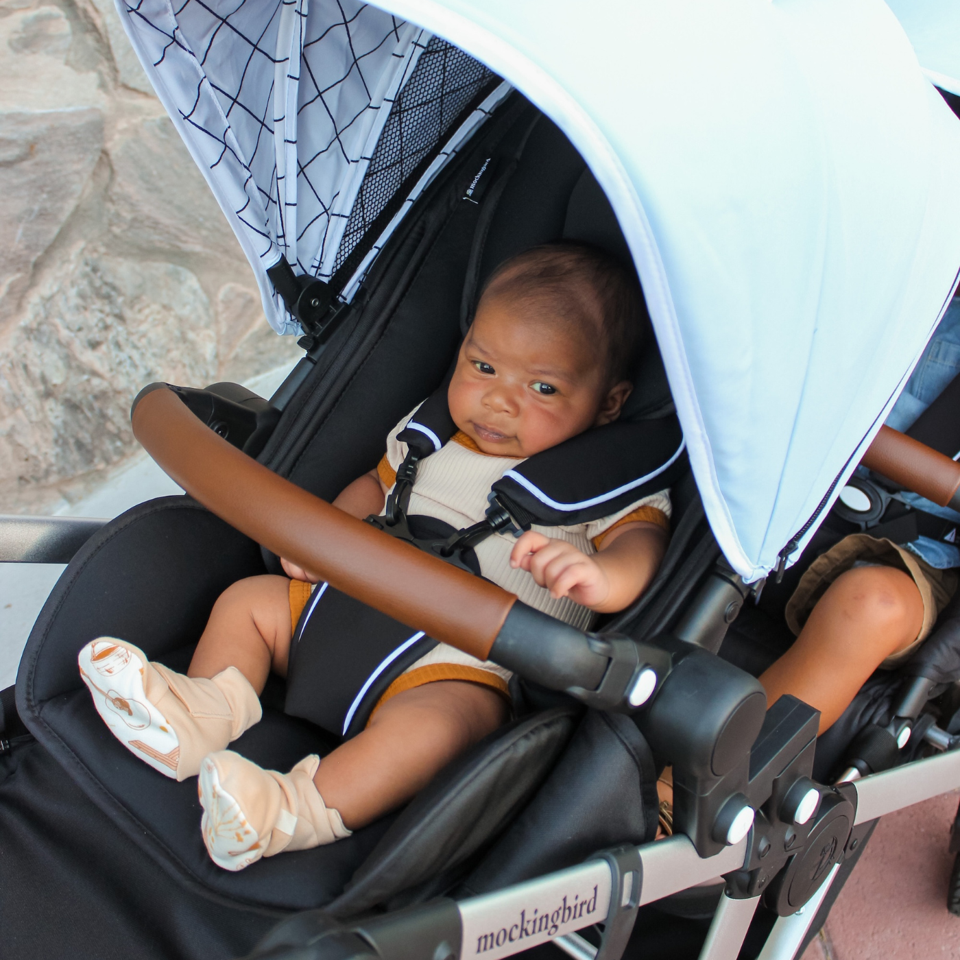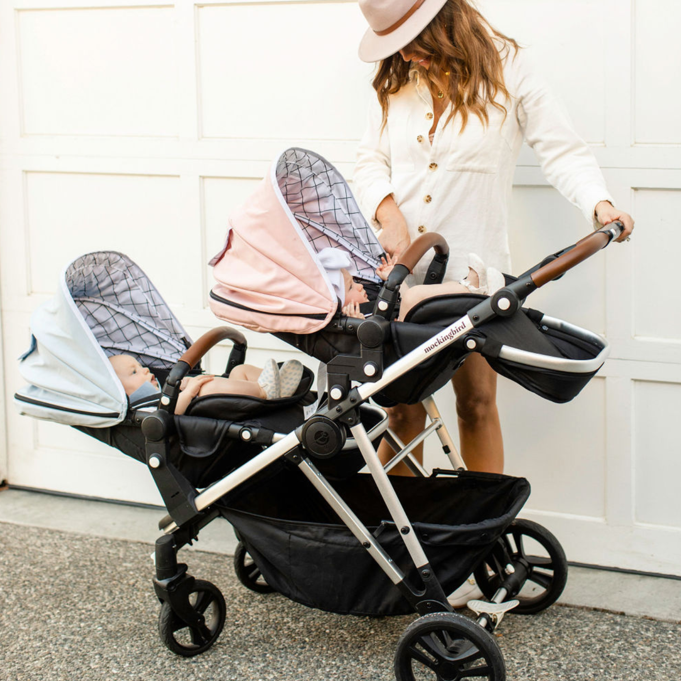 The Bassinet can be used on the Single-to-Double Stroller in double mode, and unlike other modular strollers, the Mockingbird Stroller allows you to use the Bassinet in either the top or bottom position.