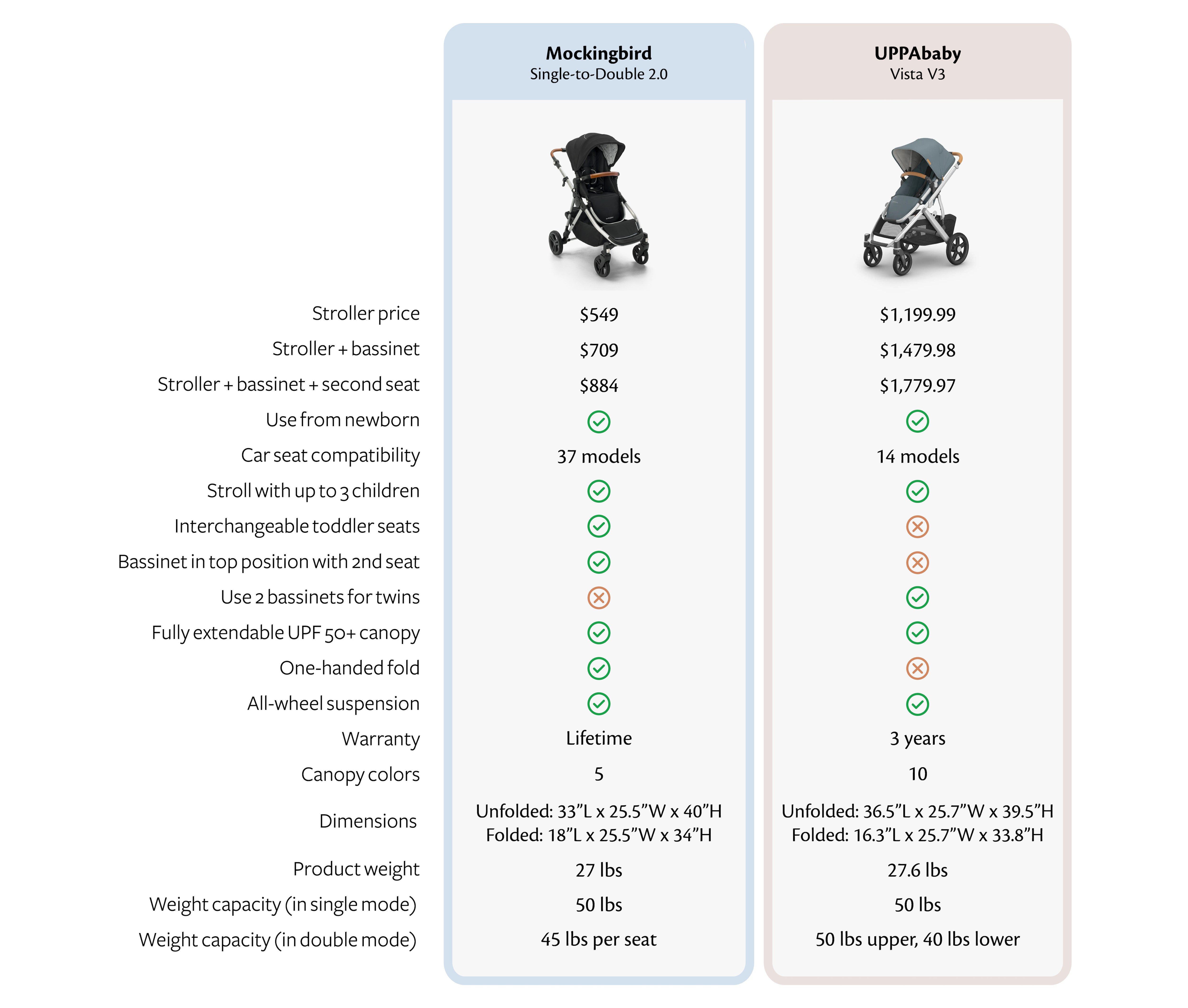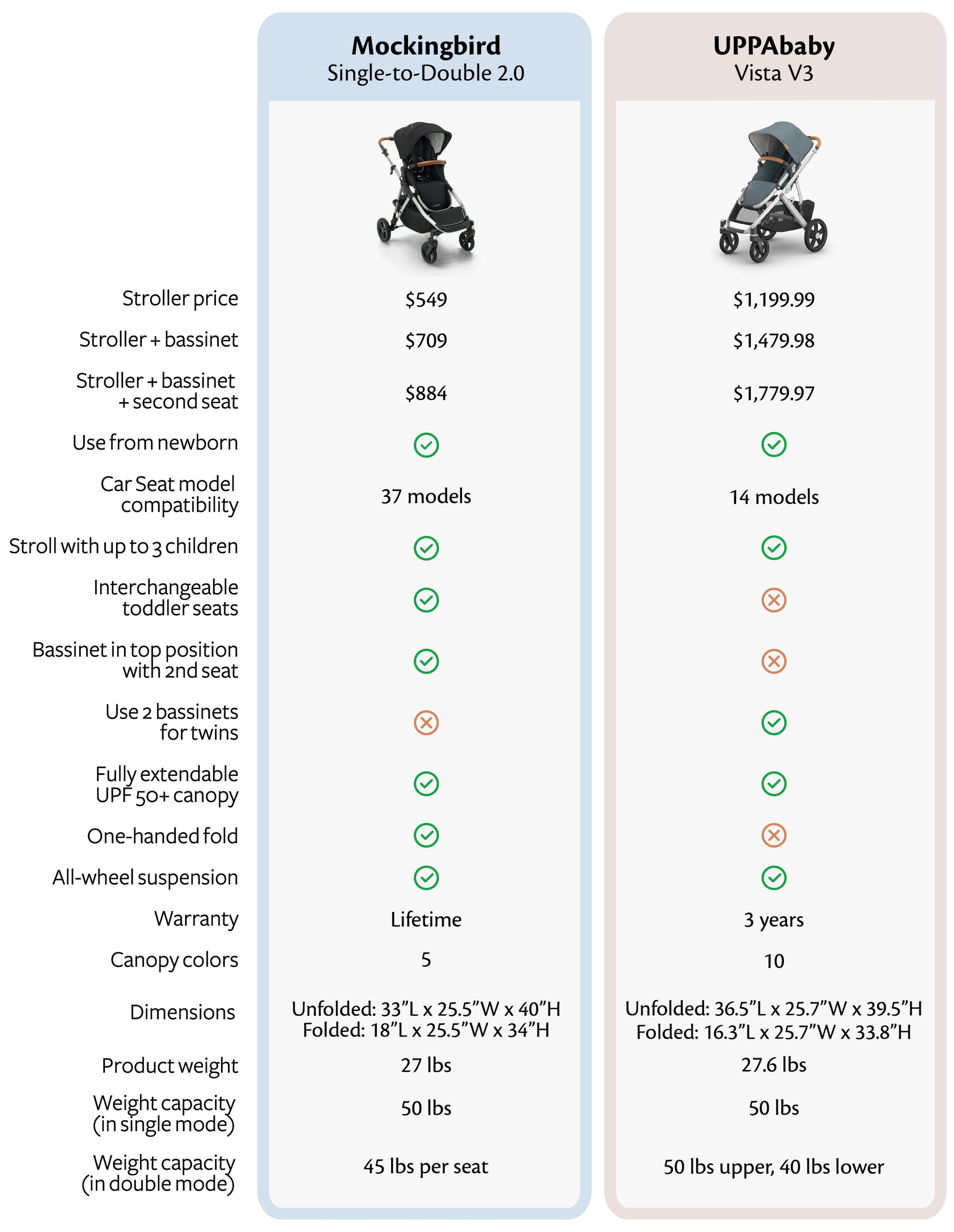 The Mockingbird Single-to-Double 2.0 starts at $549, while the UPPAbaby Vista V3 starts at $1,199.99—meaning Mockingbird is about half the price of the Vista.