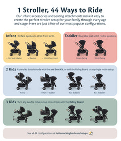 The Stroller starts as a single, then expands to a double with the 2nd Seat Kit if your family grows. With three infant accessory options as well as the Riding Board attachment, you can create the perfect setups for your family at every age and stage.