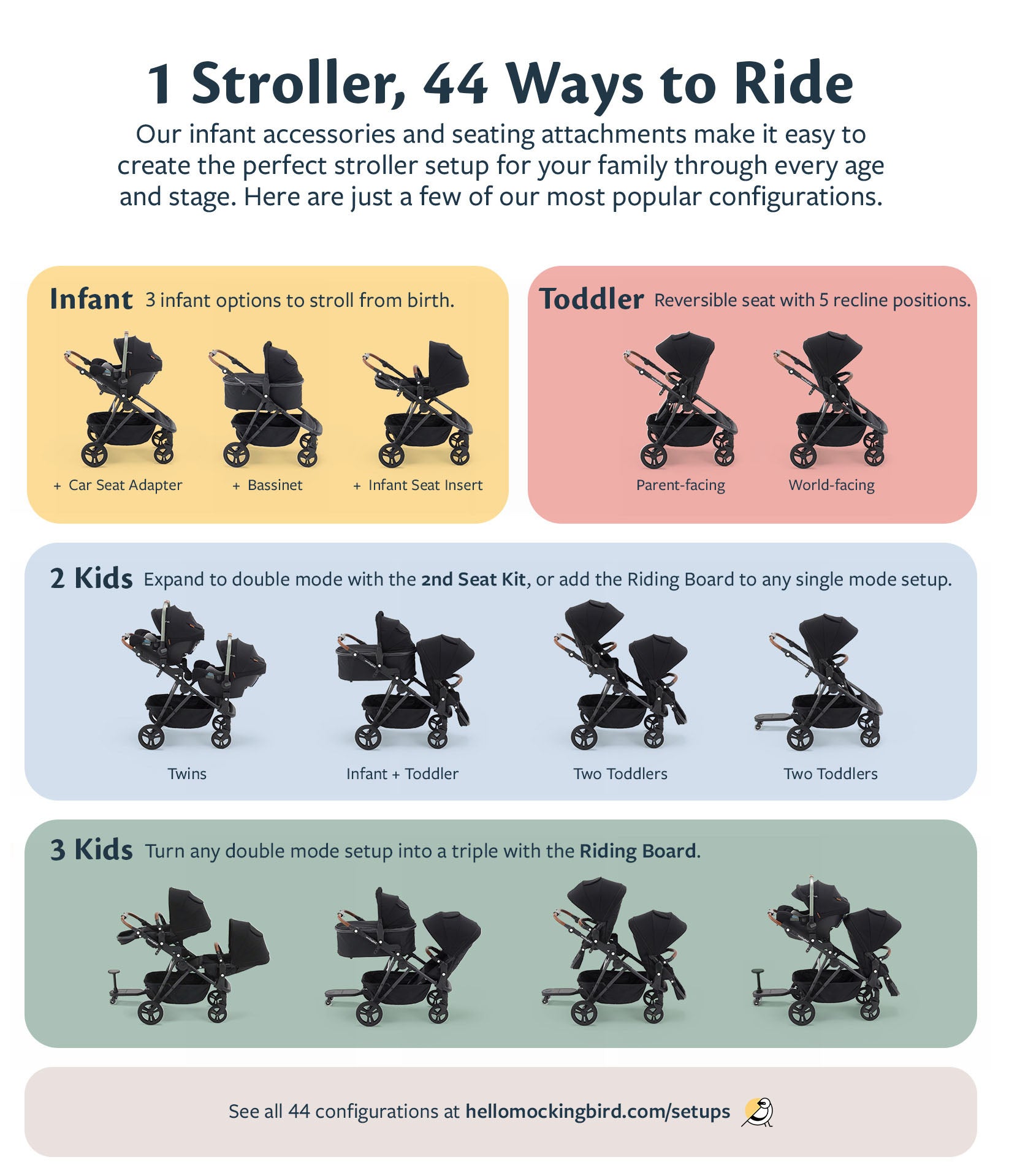 Here are all the setups in which you can use the Mockingbird Single-to-Double Stroller.