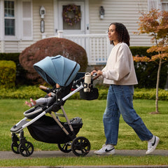 An easy-access XL stroller basket holds 25 lbs to fit your diaper bag, toys and even groceries. New in-seat child pockets and back-seat parent pockets keep essentials like snacks, phones, and tiny treasures within arm’s reach.