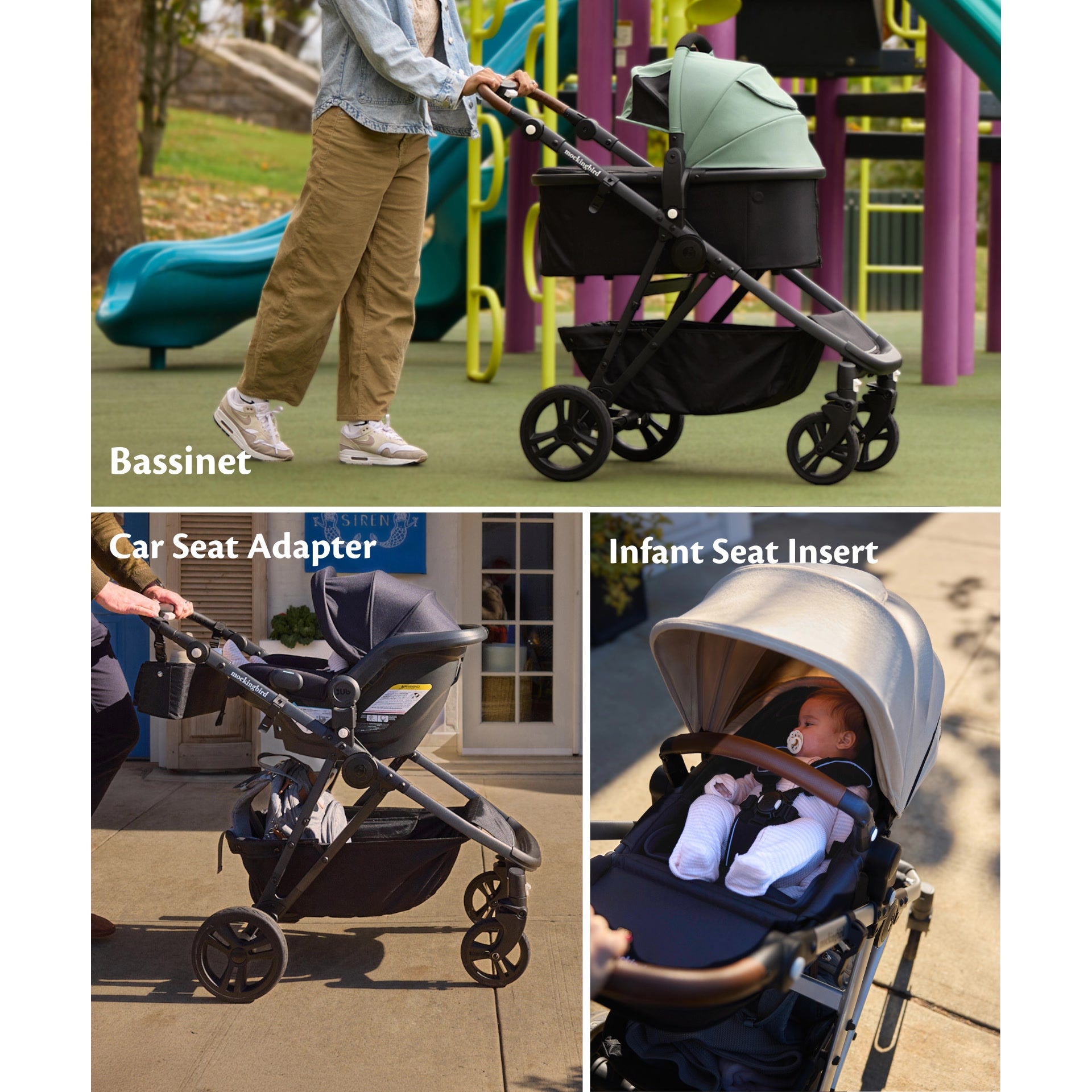 Minimum age: 3 months, or use from burth with Mockingbird’s Infant Seat Insert, Bassinet or Car Seat Adapter (all sold separately)